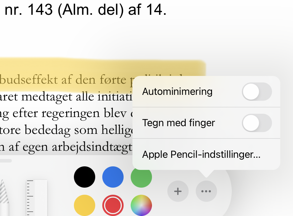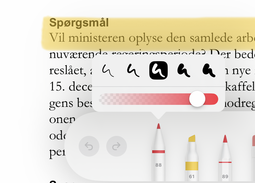 Så åbner der sig en værktøjslinje i bunden. Her kan du vælge hvilken pen du vil bruge. Der er både penne til at skrive med, til at fremhæve med og til at vælge med (f.eks. hvis du vil slette noter i et område).