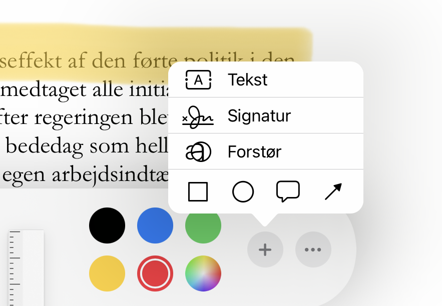 Klik på +'et i værktøjslinjen og vælg "Tekst". (Du kan også herfra indsætte figurer, firkanter, cirkler, talebobler og pile)