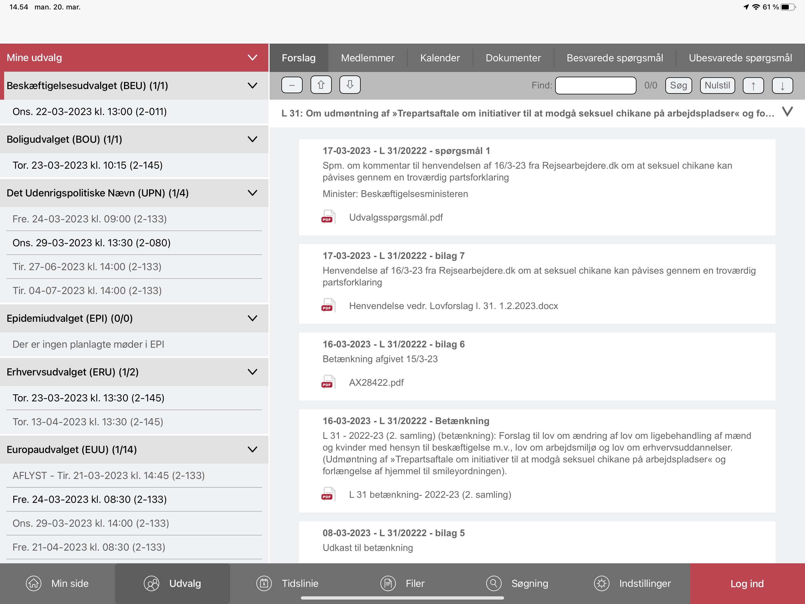 På Udvalgs-fanen finder du et udvalgs dagsordner, forslag, dokumenter, medlemmer og kalender.
